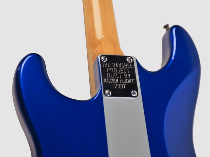 The Banshee is a ’95 Mazda Miata that we stuffed a 400hp 302 Ford into. Since the whole point here was to take a cheap Japanese car, and stuff some good ol’ American horsepower into it, the guitar had to reflect that. Malcolm Pritchett at West Kentucky collision put this one together by taking a cheap 80’s Aria Pro guitar (Japanese made) and stuffing some hot EMG pickups in it (American made). The guitar was painted like the car with a custom PPG color called “Banshee Blue”, and a silver stripe running down the center of it.