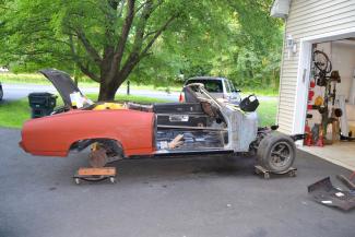 I had an "expert" welder repair some rusted body mounts and put it back together. It drove great and my wife and I enjoyed driving it for several years, As time went on circumstances dictated that I store the car which i did for about five years. After buying a house i retrieved it from storage, where all the old bondo body work had begin to bubble and crack. around 2000 I tore it down again, intending to fix the rust and get it back on the road. The deeper I went the more damage i found! Thankfully Stacy David was doing the Bronco on his show Trucks so i had a good teacher! ultimately I have replaced the entire firewall and front bodymounts , The entire floor with rockers all the way back to the one piece trunk pan. Also I found a NOS passenger quarter panel and replaced that, and repaired the driver side quarter panel with a coupe panel, which I seamed in.(still working on finishing that). Did I mention replacing the driver side rear wheel house entirely?