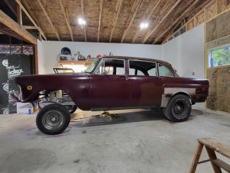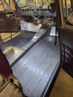 Now onto the body. Wanting the gasser look with wide meats out back, I bought a set of Tri-5 Chevy radiused wheel arches and patched them into the rear quarters, taking care to blend the lip of the arch into the factory bodyline that formed the original wheel opening. I also had to hand form a lot of patch panels, ranging from small to the entire upper edge of the right rear quarter. With the looks coming along, it was time to tackle the floor. Knowing that I couldn’t do the job myself, I towed the car to my friend’s garage, and we began regretting almost all our life decisions. We decided to brace the body further and cut the entire floor out along with what was left of the inner/outer rockers. My buddy then hand-made hat channels and inner rockers, I fabricated inner kick panel replacements, and we got to work setting the body in its final location before building the floor structure. We made the floor out of 3 pieces, a full sheet per side, formed and bead rolled, with a custom tunnel made in my buddy’s metal brake. For the first time in at least 30 years, the car’s body was solidly attached to the chassis.