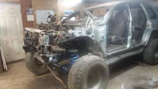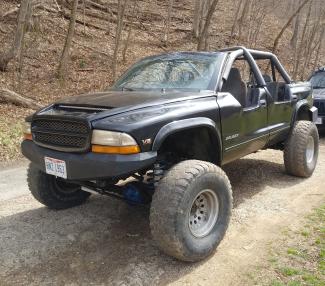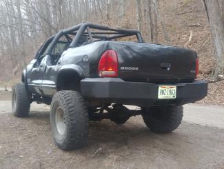 I bought this 2000 Durango that was rolled for 500 bucks on plans just for parts engine, trans, axles, ect.but after a few beer got this crazy idea to straight axle it, then one thing lead to another and with in a year I had a 2000 Durango that's ive dove tailed the front 8'', made a custom hood with a recessed light bar, half doors and cut the top off and added a full roll cage ,and custom built bumpers. it sits on a dana 44 in the front and Chrysler 9.25 in the rear both from a 2001 dodge ram.