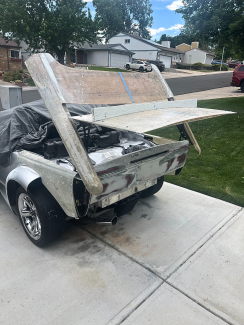 The side panels and rear fenders are a work in progress. A new frame was located and purchased, and the fabricated fiberglass will be completed after the body swap. The dual articulation of the rear deck and fabricated tonneau was a successful achievement!