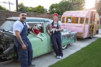 Natalie stripped the Shasta down to the frame to replace a lot of rotted wood and interior Burch. She also replaced some rotted floor wood, and rewired the entire trailer. She's now in the process of installing new metal. She's refinished all the interior cabinets and fixtures, and upgraded exterior lights to LEDs. Then we'll paint match the trailer to the Cadillac.